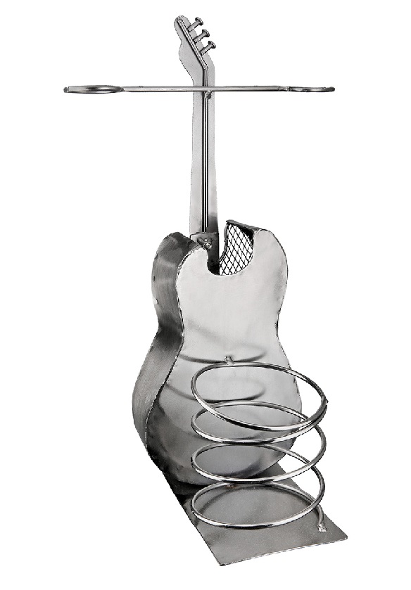 Hier erhalten Sie unseren Weinflaschenhalter in Gitarrenform, inklusive Halterung für zwei Weingläser und einem Fach zur Aufbewahrung von Korken.