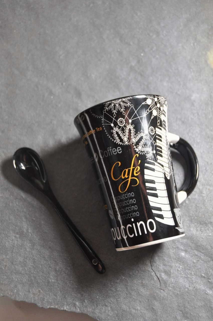 Die Tasse ist spülmaschinen- und mikrowellengeeignet. Größe Tasse ~13 x 9cm, Löffel ~ 15cm