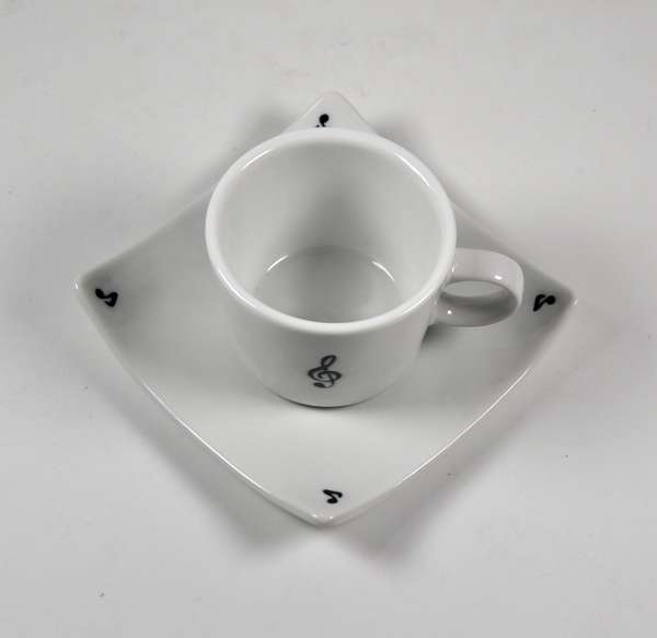 weiße Keramik-Tasse mit dekorativem Notenschlüsseldekor, Höhe ca. 65mm